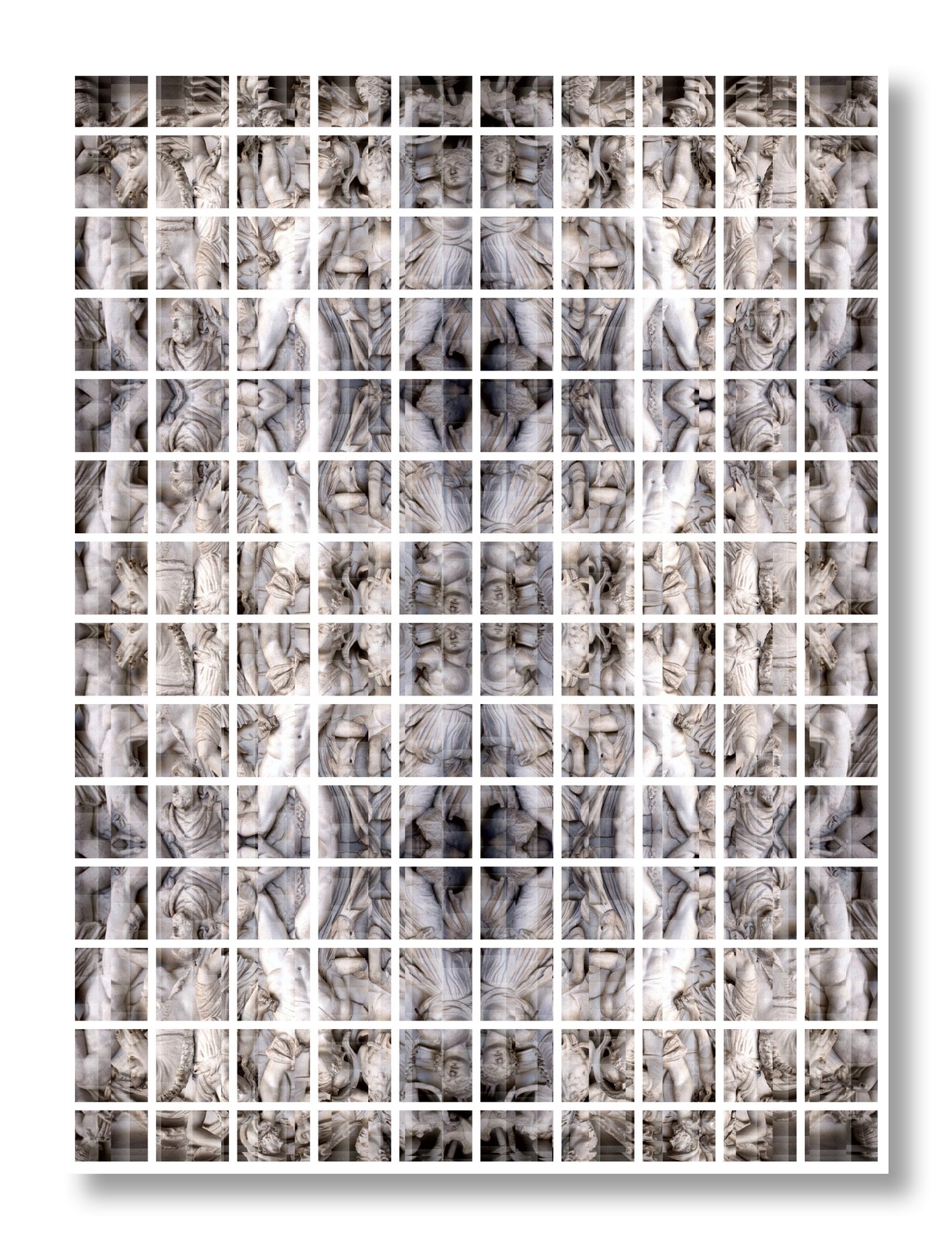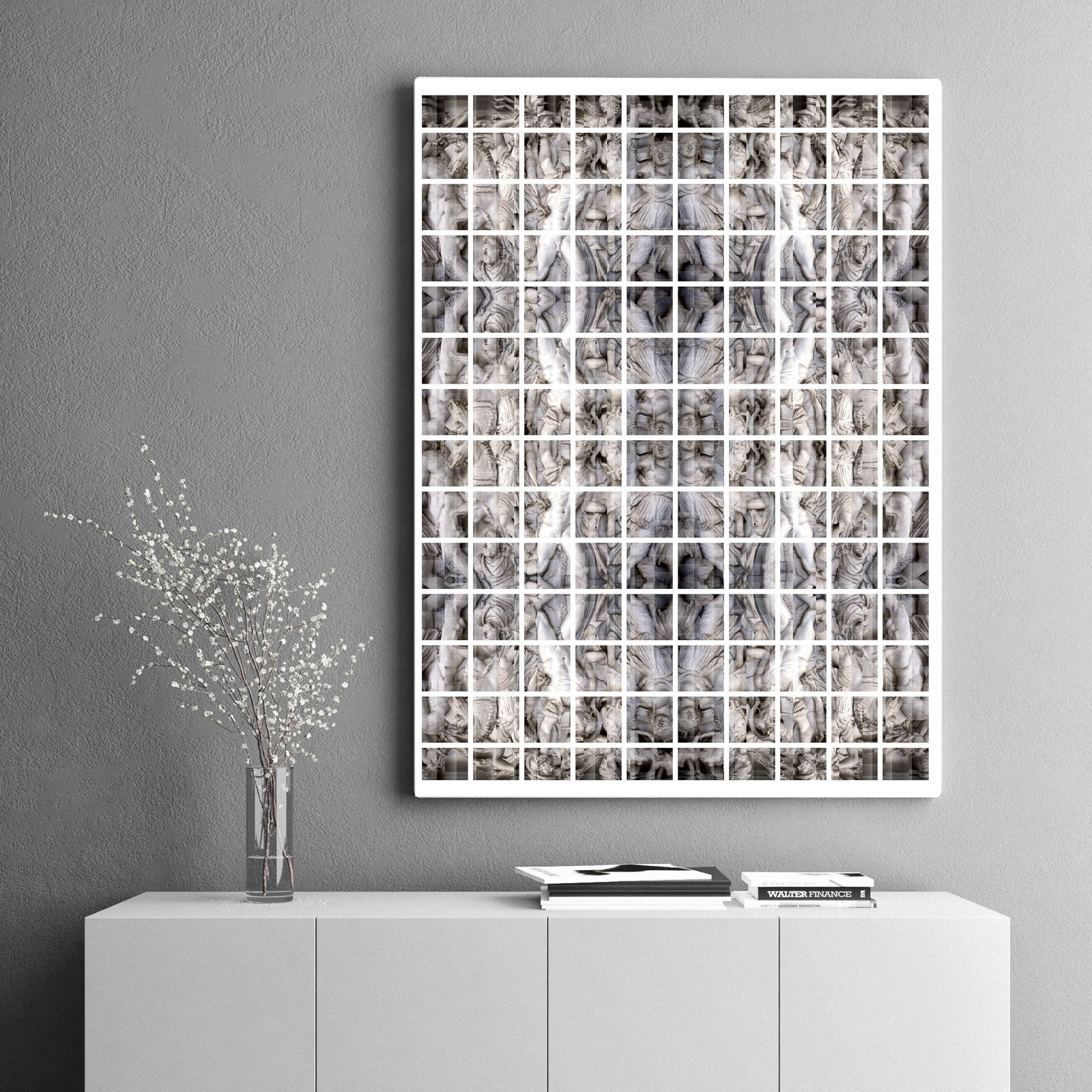 HECATE (Triplex Anima) reimagines the ancient theophoric goddess not as a figure but as a field of distributed presence. The grid becomes a cosmology: a fractured, recursive architecture where marble bodies splinter into hundreds of micro-gestures. In this lattice of repetition and displacement, the classical relief is no longer a narrative surface but a psychic mechanism, a site where fragmentation becomes a mode of revelation. The work draws upon Hecate’s triple form, her dominion over crossroads, thresholds, and lunar transitions. Yet the triadic body here is not depicted; it is inferred through discontinuity. Faces dissolve into torsos, serpentine forms emerge from folds of drapery, and equine limbs flicker like afterimages of Thessalian myth. What remains stable is not identity, but multiplicity: the sense that the image thinks in three directions at once. Through deconstruction and recomposition, the marble becomes porous, almost organic, as if inhabited by the anima mundi, the world-soul that animates all living forms. The mythic archive of Artemis, Diana, Hekatos, and their syncretic shadows is sublimated into a dream-logic where eros and thanatos operate simultaneously. The result is an uncanny surface, rich in pareidolic potentials: witchcraft, moonlit metamorphoses, and Freudian residues appear and vanish depending on the viewer’s position. This is not an illustration of Hecate; it is a method of thinking her. A contemporary re-inscription of the goddess into a visual system that resists linear narration. The sculptural world, so stable in its classical origin, is here subject to dissolution, recompression, and spectral echo. Heroic bodies, serpents, shields, and mythic animals fold into one another until the image becomes a threshold organism – neither sculpture nor photograph, but an experiential matrix of myth, psychoanalysis, and metamorphosis. HECATE (Triplex Anima) occupies the territory between coherence and unraveling, between magic and archaeology. It proposes that myth survives not in its stories, but in the patterns of disturbance it continues to generate.