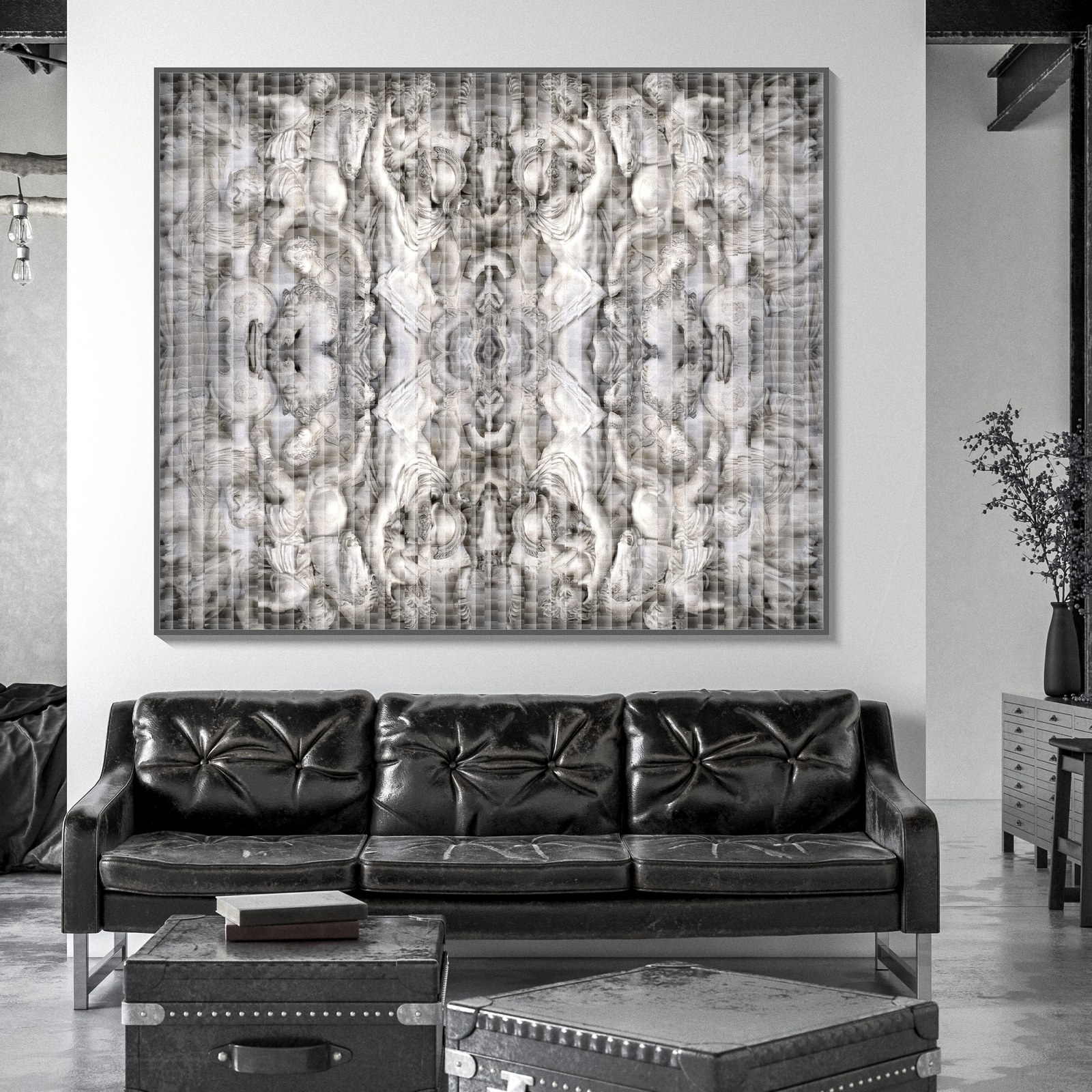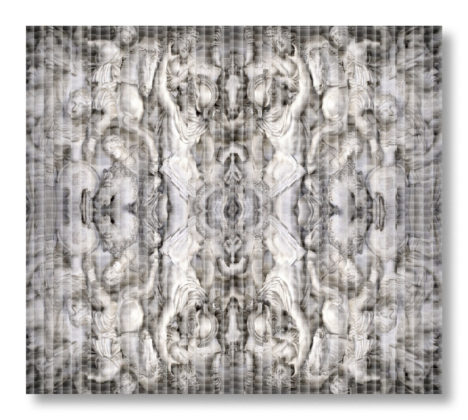 FRAGMENTA DEORUM reexamines classical mythology through a contemporary process of visual decomposition and reassembly. In this series, Alexandru Crișan approaches the divine body not as a fixed icon but as a mutable structure – an image that can be dismantled, reorganized, and reanimated through the logic of the fragment. Trained as an architect, Crișan adopts an analytical method in which sculpture becomes material, symmetry becomes strategy, and the image behaves like a spatial system rather than a narrative scene. Each work operates within a field of controlled instability. Fragments of ancient reliefs, gestures, and anatomical details are multiplied and recomposed into new configurations where recognition and uncertainty coexist. These images provoke pareidolia: faces emerge where none were placed, mythic creatures surface from folds of marble, and bodies appear to oscillate between coherence and dissolution. Meaning does not reside in any single element but in the shifting relations among them. The series engages mythology as a psychological reservoir rather than a storytelling device. Echoes of Greek and Roman deities – Medeia, Hecate, Cassiopeia – are not depicted but inferred, surfacing through repetition, distortion, and dream-like recombination. This oneiric dimension aligns the work with psychoanalytic readings of the image, where memory, desire, and symbolic residue intertwine. The divine re-enters contemporary vision not as a stable figure but as an afterimage: a structure of intimation, erosion, and metamorphosis. FRAGMENTA DEORUM proposes that fragmentation is a generative force. Through decomposition, the sacred is not lost but redistributed; through recomposition, myth becomes newly legible. Each artwork stands as a contemporary relic, a threshold where architecture, mythology, and the unconscious converge. Crișan’s images reveal that the gods persist – not in their intact forms, but in the fragments through which they continue to speak.